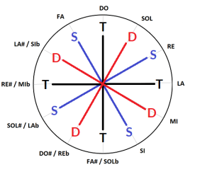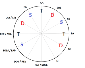 Pero, ¿es esto coherente con el sistema tonal? En el caso de la Tónica, está claro que, en DO (mayor/menor), los acordes sobre LA y sobre Mib también pueden funcionar como tónica. ¿Puede el acorde sobre FA#/SOLb funcionar también sobre tónica? ¿No está demasiado lejos, con una diferencia de 6 quintas?
