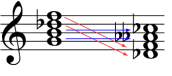 Que, enarmonizándolo, contiene las mismas cuatro notas que la dominante de SOLb (o FA#) con la 5ª rebajada. Por supuesto, hablamos de sonidos, aunque en la sintaxis tonal haya que usar enarmonías, como se aprecia en la figura: