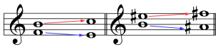 No obstante, el intervalo entre FA y SI es una 4ª aumentada (tritono). Es un intervalo que divide la octava en dos partes iguales, por lo que, si lo invertimos, tendremos el mismo intervalo (tritono, aunque con la forma de 5ª disminuida). Al ser simétrico, podemos considerar cualquiera de esas dos notas como sensible, y por lo tanto, los mismos dos sonidos (con las enarmonizaciones correspondientes), podrían resolver en estas dos tónicas: