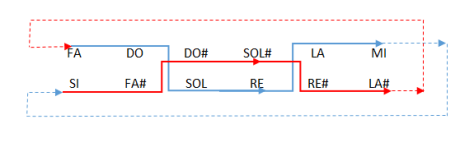 Fijémonos en la que comienza en DO. Podemos ordenar las notas por patrones regulares de 4ª J descendente y semitono ascendente, muy similar a lo que hicimos con la escala 1-2 mencionada antes: