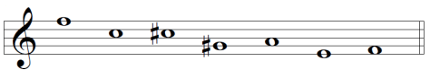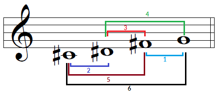 Se puede ver fácilmente que tenemos todos los intervalos desde 1 hasta 6 semitonos, y por extensión, también tendremos sus complementarios al cambiar de octava una de esas notas. Como curiosidad, sólo hay otro set de notas (a partir de esa primera, por supuesto) que constituya el mínimo imprescindible para tener todos los intervalos. Es el que saldría disponiendo los intervalos a la inversa. Así, los dos únicos “All Interval Set” posibles desde esa nota inicial son: