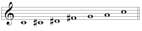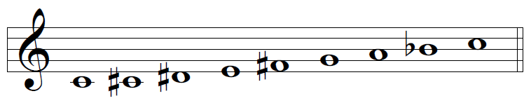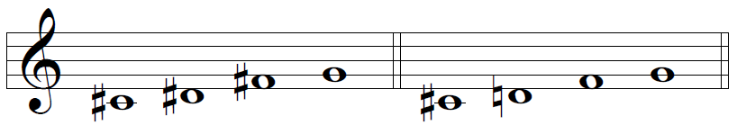 Bartók basó algunas de sus escalas en notas que surgen como combinaciones de estos números de semitonos. Son las llamadas “escalas cromáticas” (esta terminología puede confundir, pero no tiene nada que ver con la escala que contiene las doce notas del sistema temperado). Así, tenemos estas posibilidades: