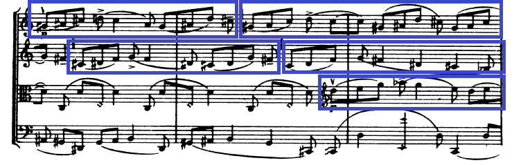PARTICULARIDAD COMPOSITIVA: Bartók no sólo pretendía que estos dos elementos contrastantes le sirviesen a él como compositor, sino también que fuesen identificables por el oyente. Por eso, los trazos melódicos que sigue al usar escalas cromáticas suelen ser circulares, con movimientos ascendentes y descendentes entremezclados y con profusión de cromatismos. La siguiente figura muestra algunos ejemplos.