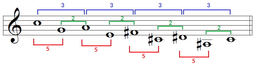 Además, podemos ver que, si disponemos las alturas diferenciando los ejes (con el patrón 4ª J descendente + 2ª M ascendente), nos salen números sucesivos de la secuencia de Fibonacci (2, 3 y 5).