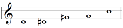Escala 1-5: Surge del patrón “semitono-4ª justa”. Es una escala que solo tiene 4 sonidos y que, además, es un subconjunto de la escala 1-2 mencionada anteriormente, tal y como se puede ver en la siguiente figura: