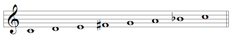 Escala 1-3: Surge del patrón “semitono-tono y medio”. Es una escala que solo tiene 6 sonidos y solo posee 4 posibles notas de inicio, como se muestra en la figura siguiente: